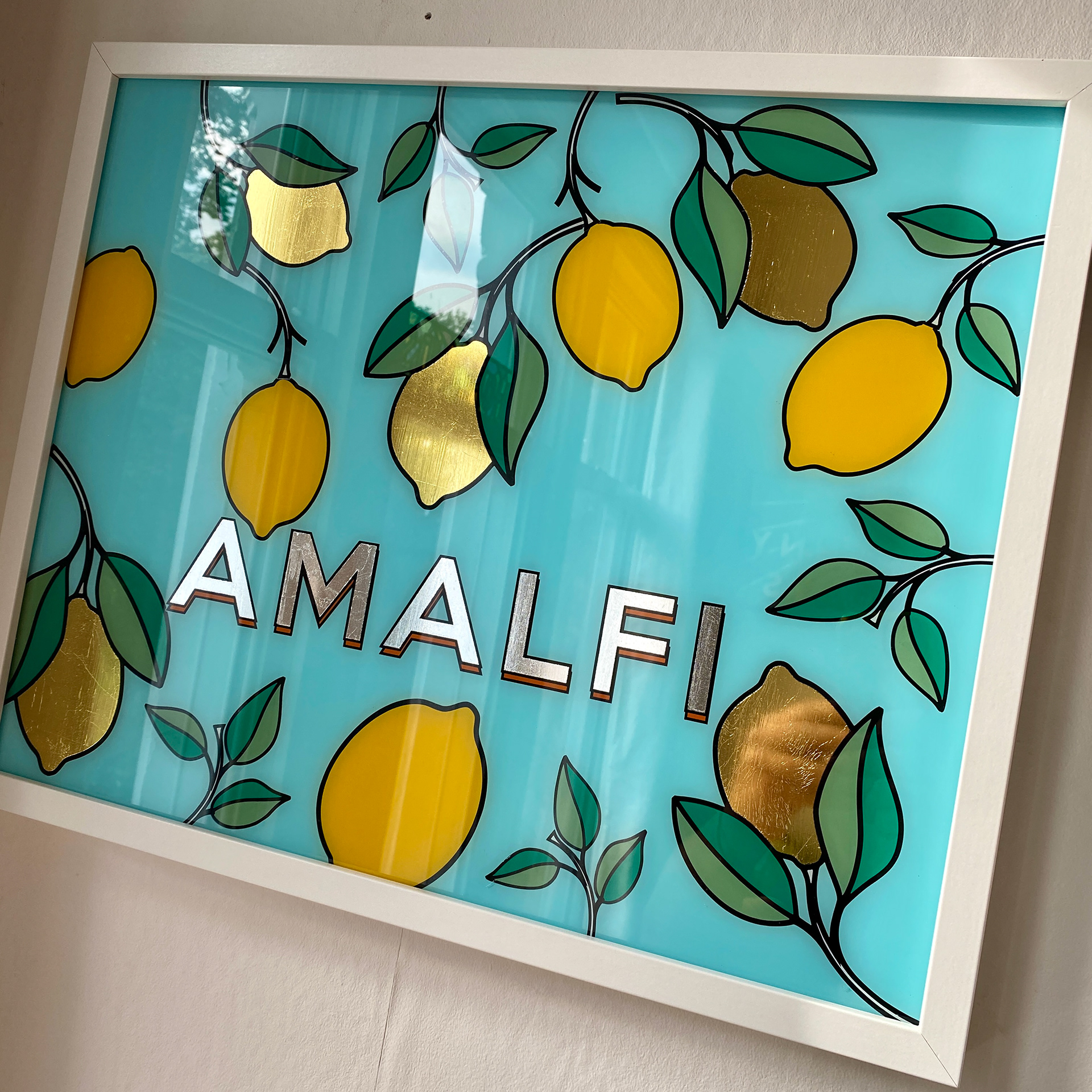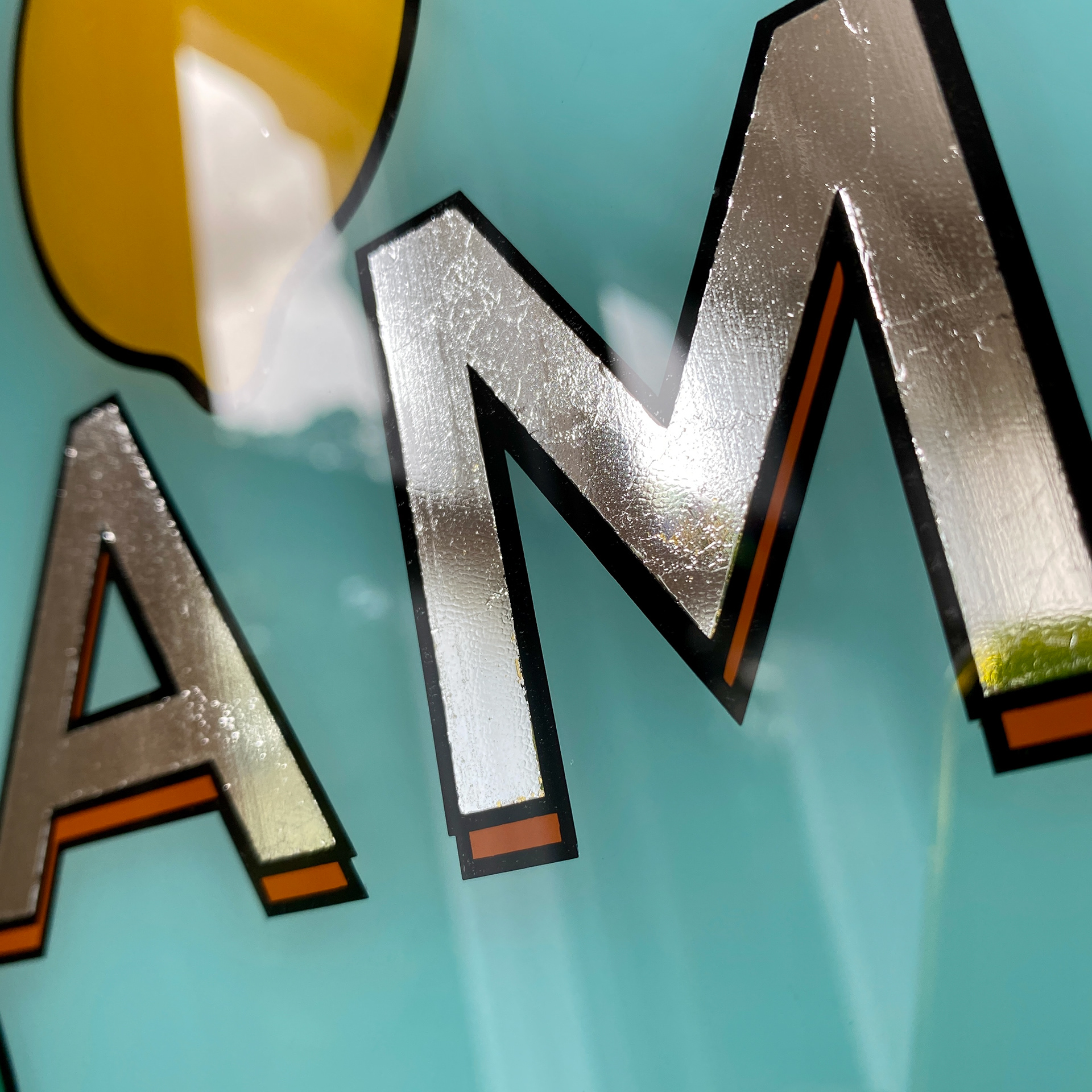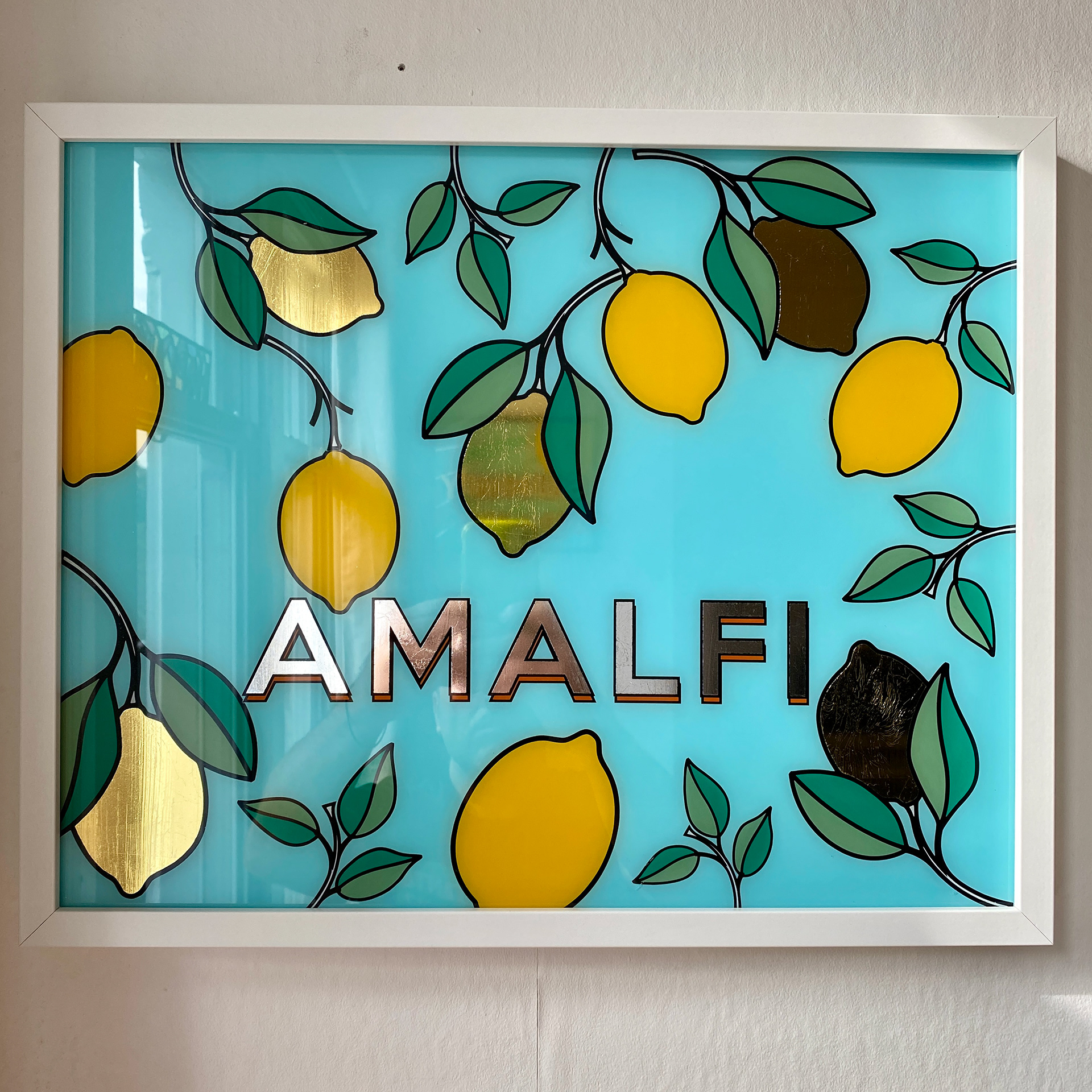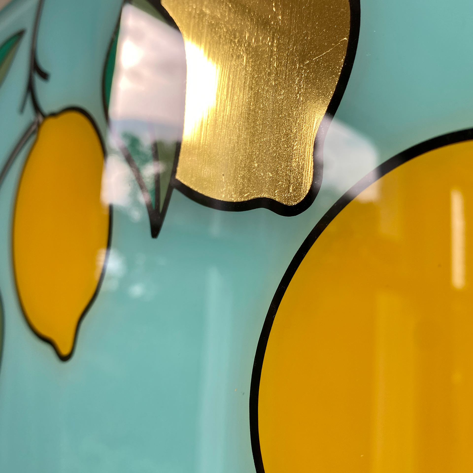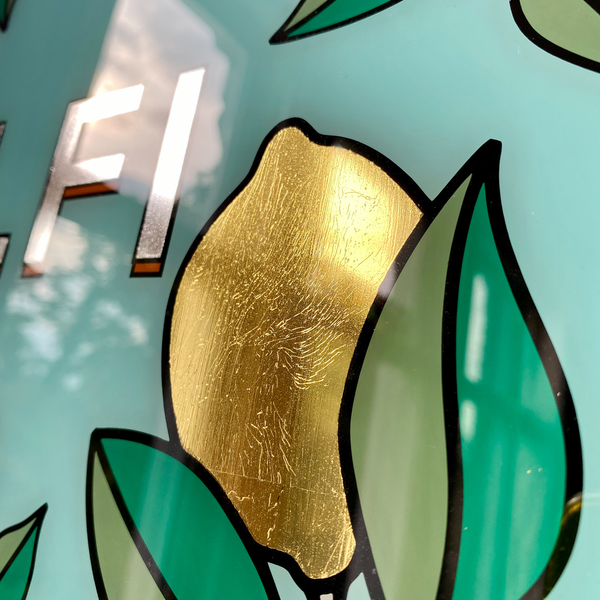 SILVER/GOLD LEAF, ACRYLIC AND VINYL ON GLASS