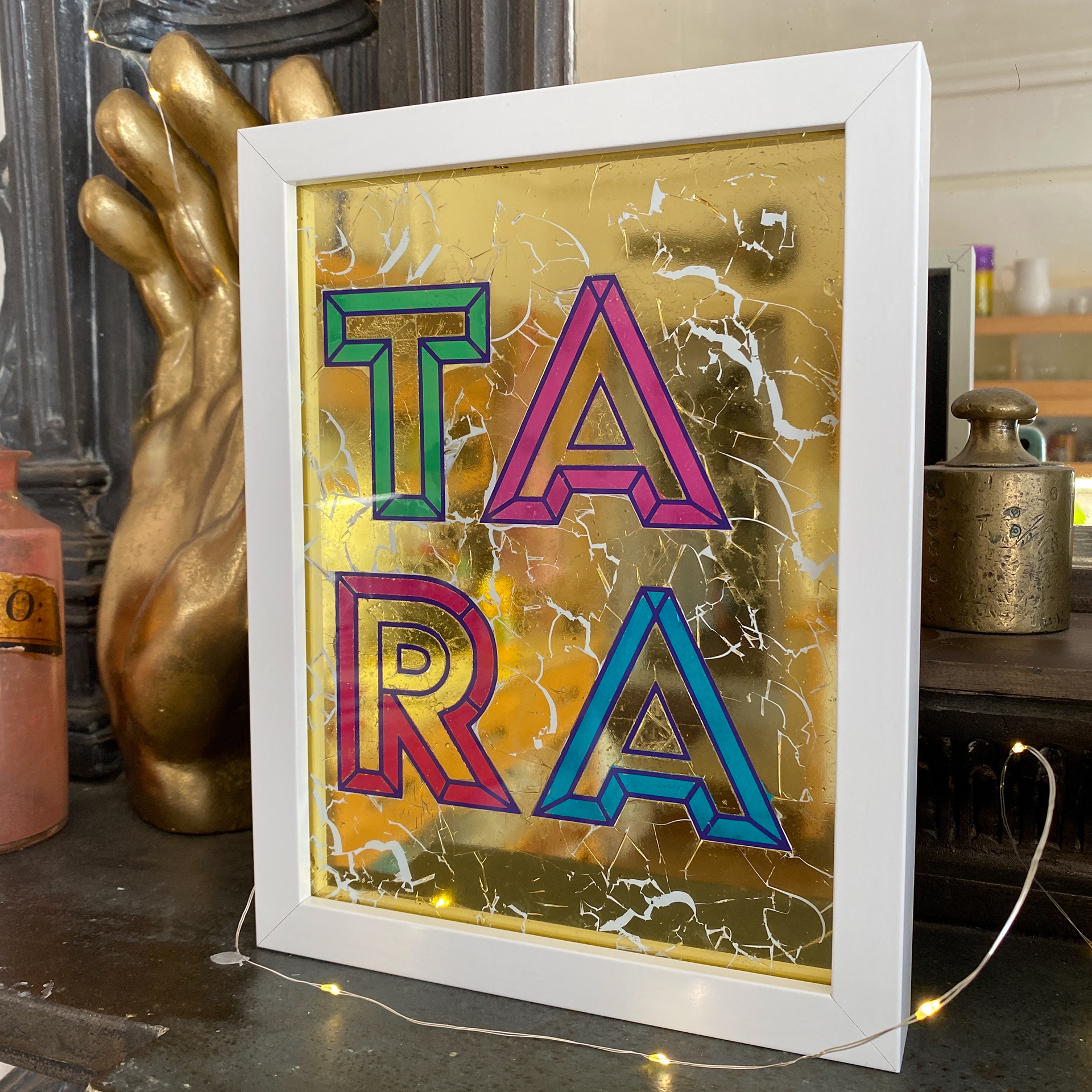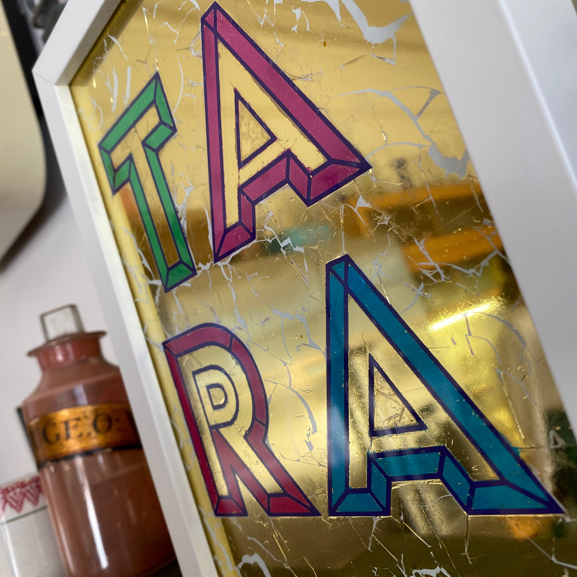 GOLD OR SILVER LEAF, ACRYLIC AND VINYL ON GLASS